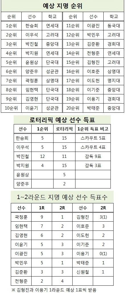 예상 순위는 주관을 최대한 배제하고, 이들의 득표수만으로 산정했다. 다만, 이윤기(성균관대)와 이광진(동국대), 이도헌(명지대)과 이기준(중앙대)처럼 동률일 경우 우열을 가리기 위해 주관이 들어갔다.