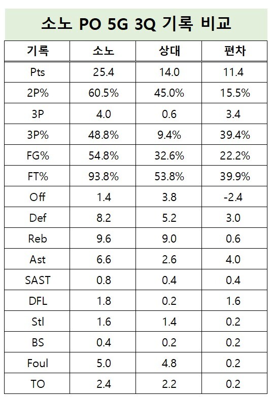소노는 평균 4개의 3점슛을 터트리면서도 상대에겐 단 0.6개만 내줬다. 3쿼터에서 3점슛으로만 10.2점을 더 올리는 것이다.