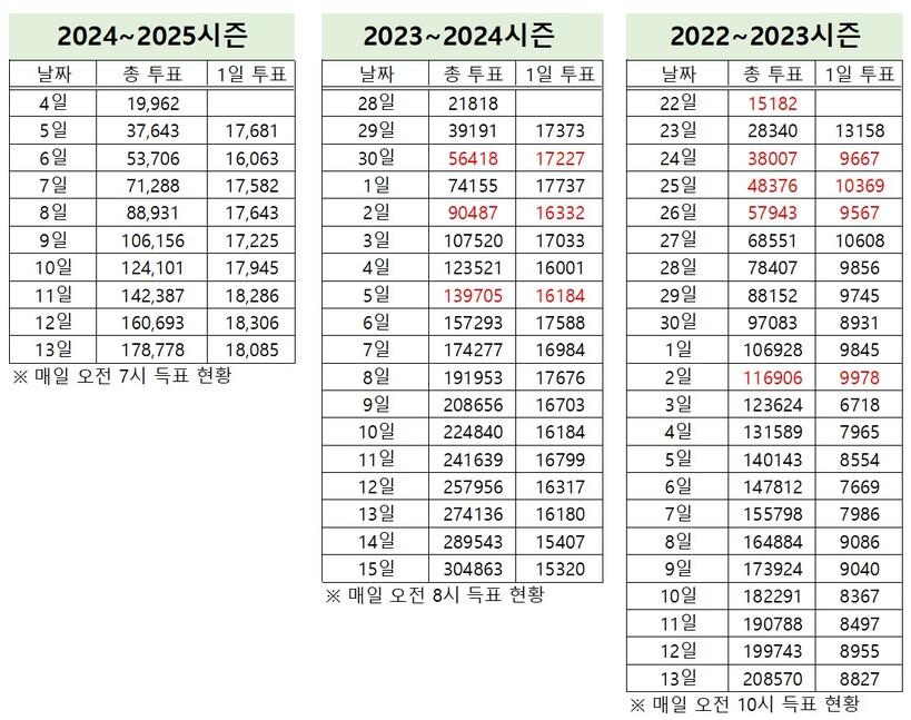 올해는 일일 평균 투표 인원이 17,000명 정도였는데 11일부터 18,000명을 넘었다.