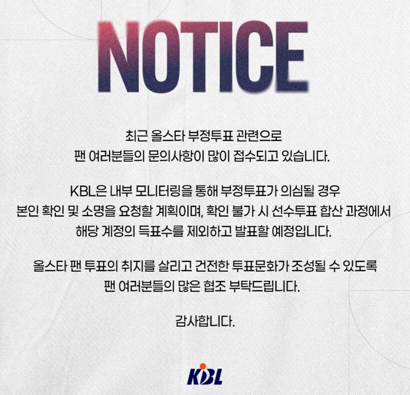 KBL은 12일 홈페이지를 통해 ‘최근 올스타 부정 투표 관련으로 팬 여러분들의 문의사항이 많이 접수되고 있습니다’며 ‘KBL은 내부 모니터링을 통해 부정투표가 의심될 경우 본인 확인 및 소명을 요청할 계획이며, 확인 불가 시 선수 투표 합산 과정에서 해당 계정의 득표수를 제외하고 발표할 예정입니다’라고 공지했다.