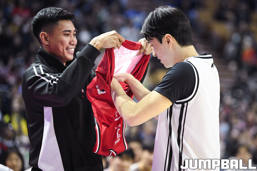 | ▲ 덩크콘테스트에 참가한 조준희에게 자신의 유니폼을 입혀주는 아반도 |