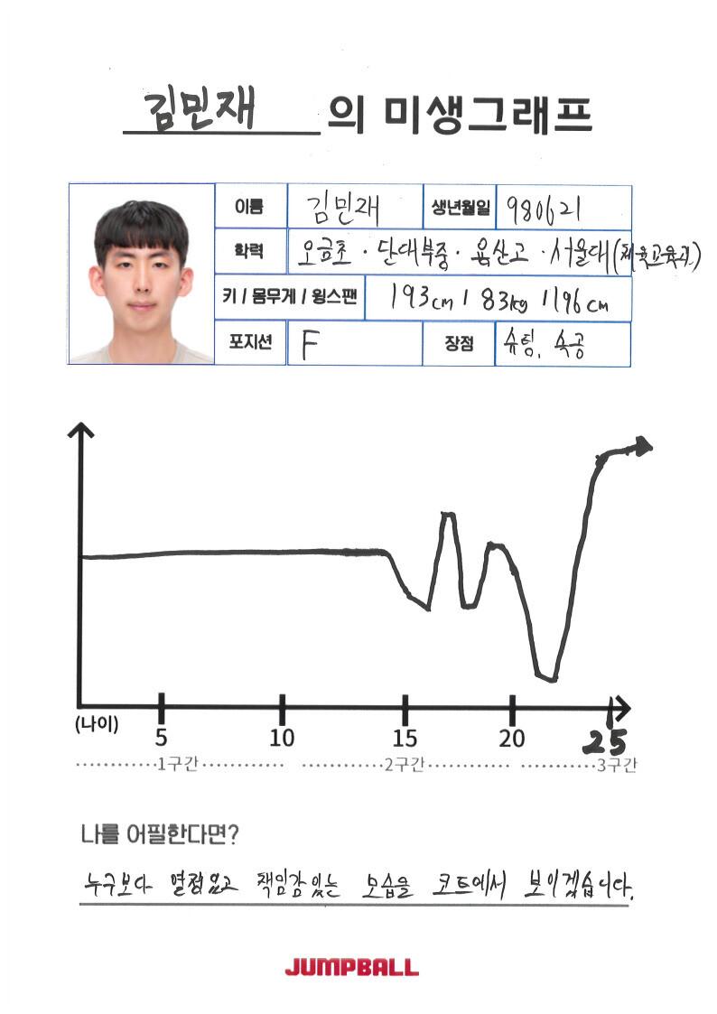 [점프볼=정다혜 인터넷기자] 서른아홉 번째 미생은 서울대 3학년 김민재(F, 193cm)다. 많은 굴곡이 있었지만, 농구의 끈을 놓지 않은 김민재의 ‘미생그래프’를 살펴보자.