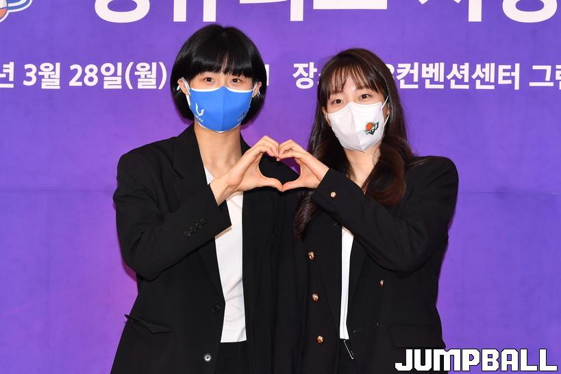 28일 서울 여의도 63컨벤션센터 2층 그랜드볼룸에서 열린 '삼성생명 2021-2022 여자프로농구 정규리그 시상식', 삼성생명 이해란과 하나원큐 신지현이 손으로 하트를 만드며 포즈를 뽐내고 있다.