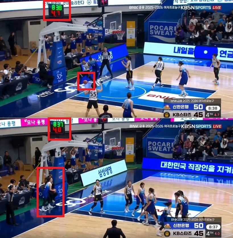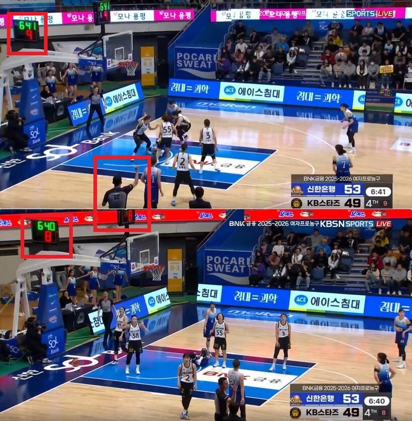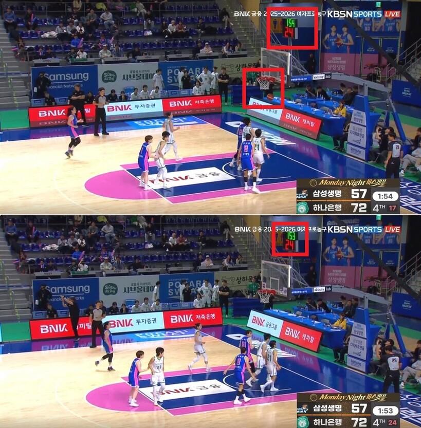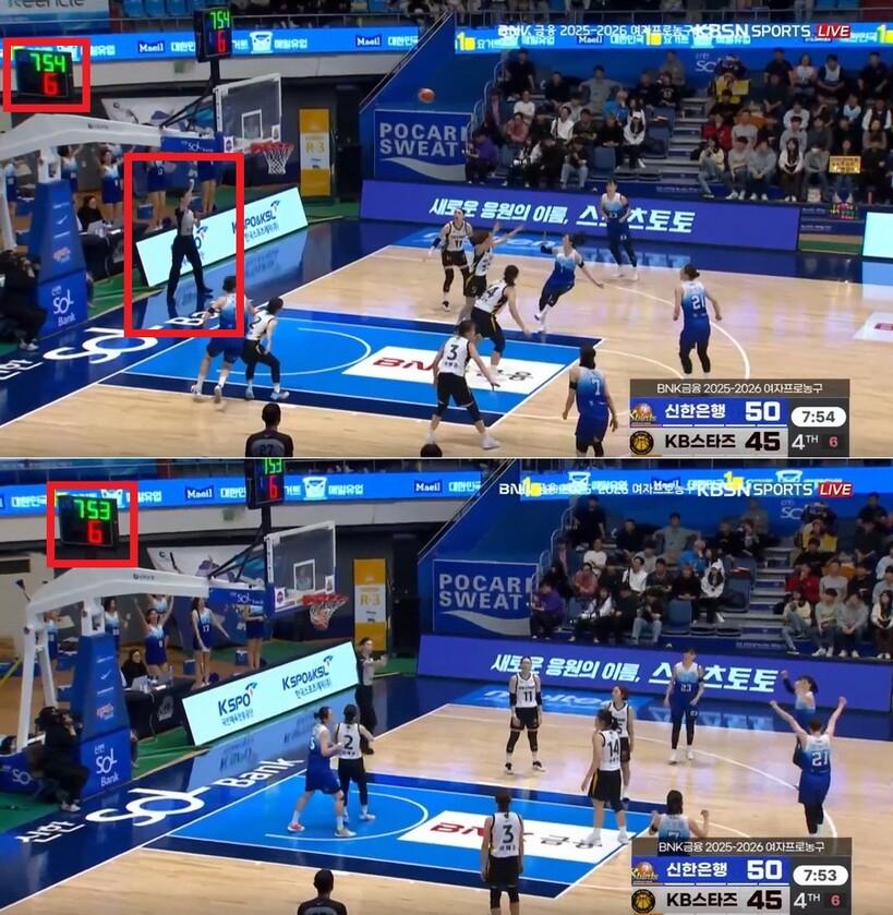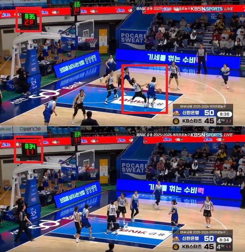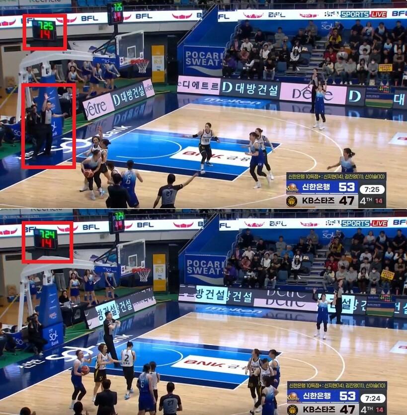 다만, 강이슬이 패스를 받았을 때보다 조금 늦게 경기 시간이 흐르기 시작했다는 게 확인된다.