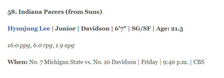 ESPN은 이현중이 58순위로 인디애나 페이서스에 지명될 것으로 예상했다. 훕스하이프 역시 지난달 23일 이현중의 58순위 지명을 예상한 바 있다. 흥미로운 것은 기보니가 그동안 드래프트 예상에서 항상 이현중을 제외한 기자였다는 점이다. 불과 지난달에도 이현중을 순위권에서 제외했었다.