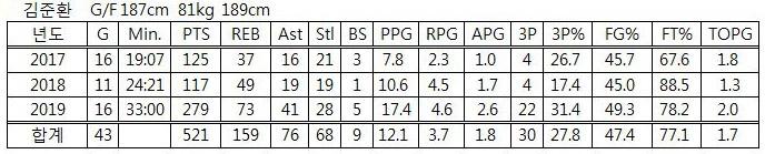 춘계연맹전 28.4Pts 7.6Reb 1.0Ast 2.2Stl 2.2BS 3P 1.8개
