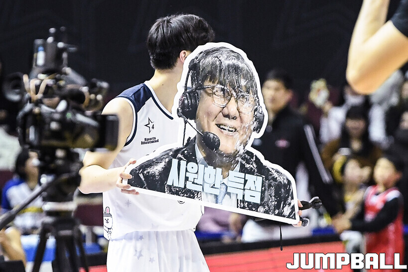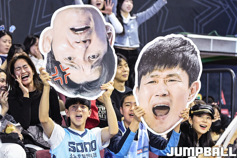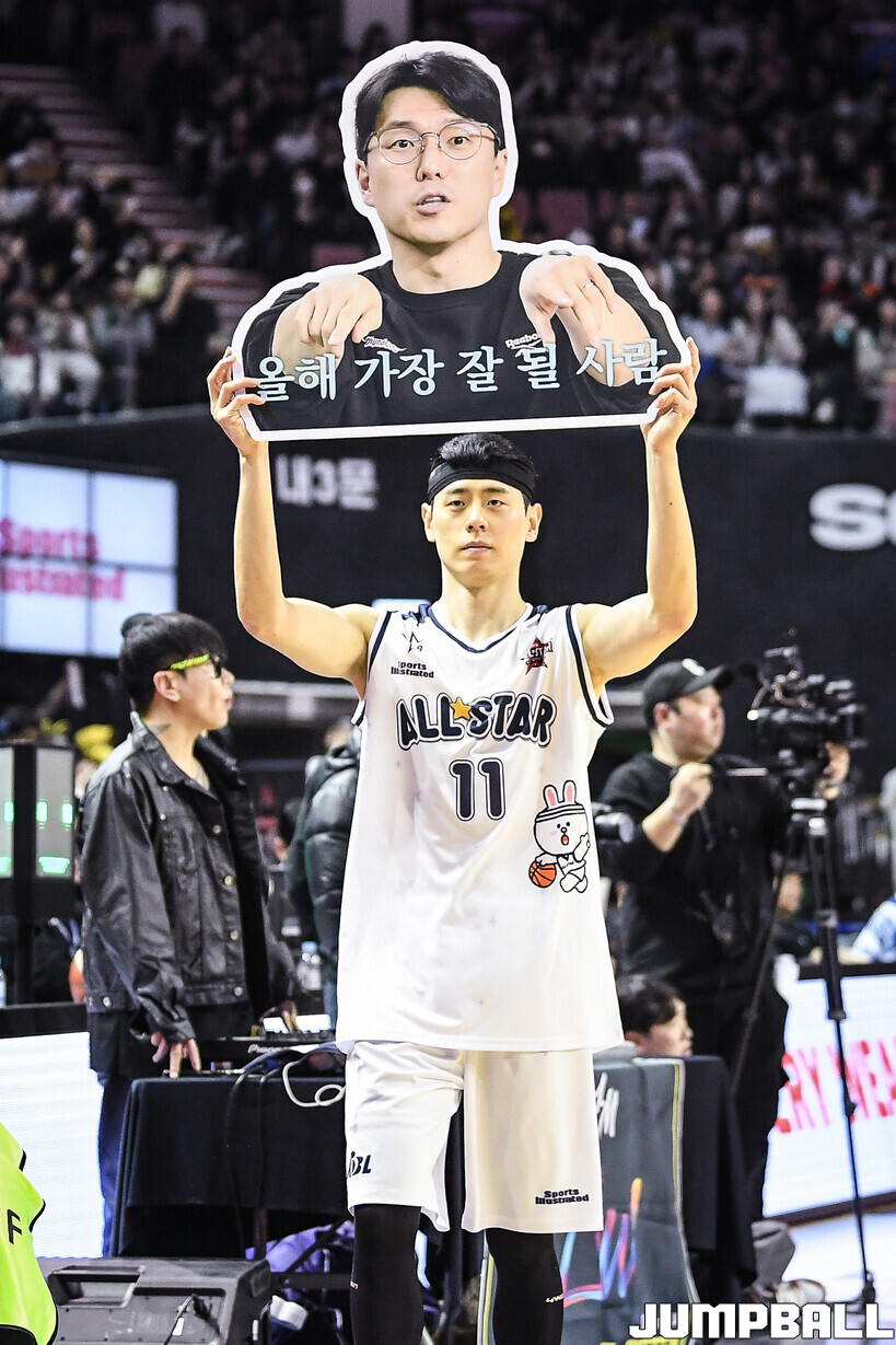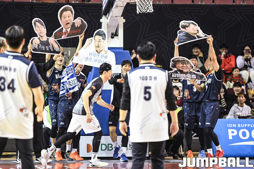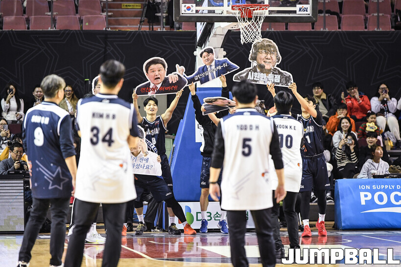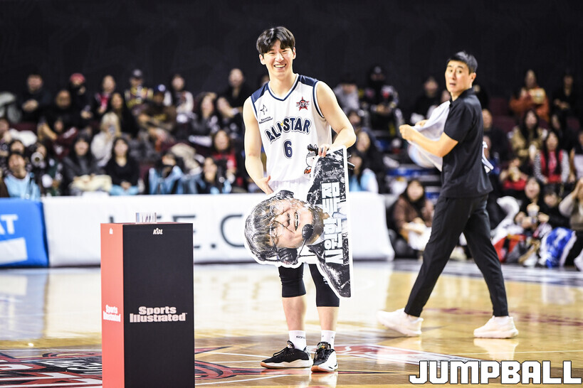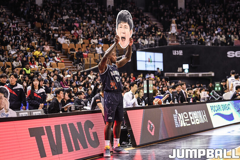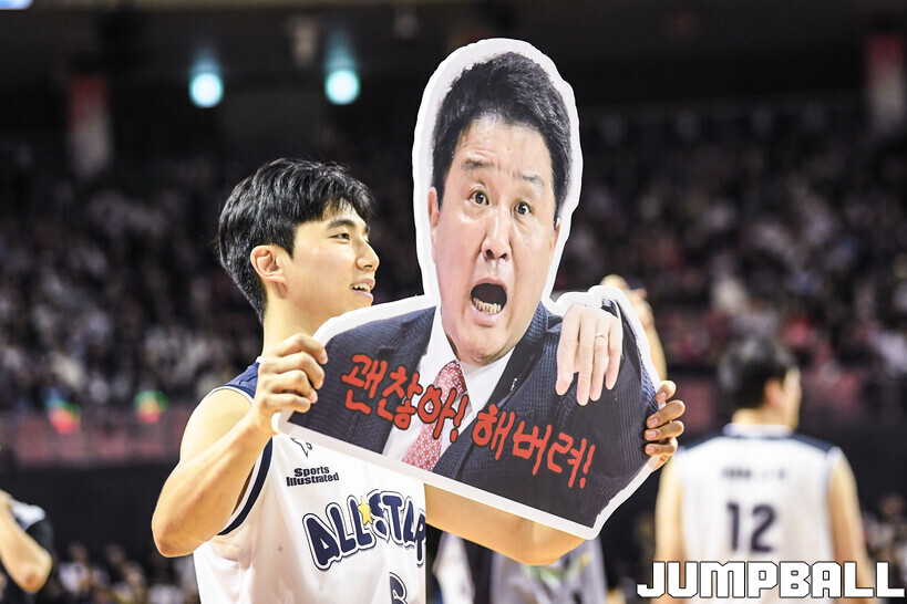 [점프볼=잠실/유용우 기자] 18일 잠실체육관에서 열린 2025-2026 LG전자 프로농구 올스타전 팀 브라운과 팀 코니의 경기, 올스타 선수들과 팬들이 감독들의 응원용 빅헤드를 이용해 응원과 장난스러운 자유투 방해를 하는 등 올스타전을 즐겼다.