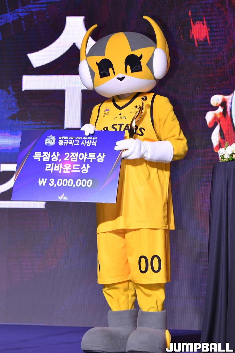 28일 서울 여의도 63컨벤션센터 2층 그랜드볼룸에서 열린 '삼성생명 2021-2022 여자프로농구 정규리그 시상식', WKBL 득점상, 2점야투상, 리바운드상에 KB 박지수가 수상했지만 코로나 확진으로 KB 마스코트가 대리수상하고 있다.