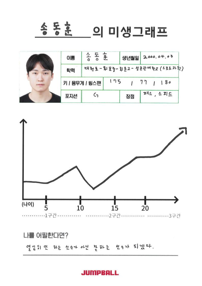 [점프볼=정다혜 인터넷기자] 아홉 번째 미생은 성균관대 송동훈(G, 175cm)이다. 꿈에 열정을 불어넣은 송동훈의 ‘미생그래프’를 살펴보자.