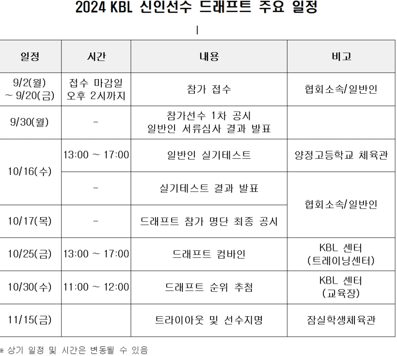최종 참가자 대상 드래프트 컴바인은 10월 25일(금), 순위 추첨식은 30일(수) KBL 센터에서 진행할 예정이다. 대망의 ‘2024 KBL 신인 드래프트’는 11월 15일(금) 잠실학생체육관에서 열린다.