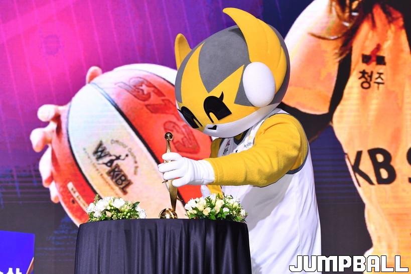 28일 서울 여의도 63컨벤션센터 2층 그랜드볼룸에서 열린 '삼성생명 2021-2022 여자프로농구 정규리그 시상식', WKBL 우수수비선수상으로 KB스타즈 박지수가 수상했지만 코로나 확진으로 마스코트가 대리 수상하고 있다.