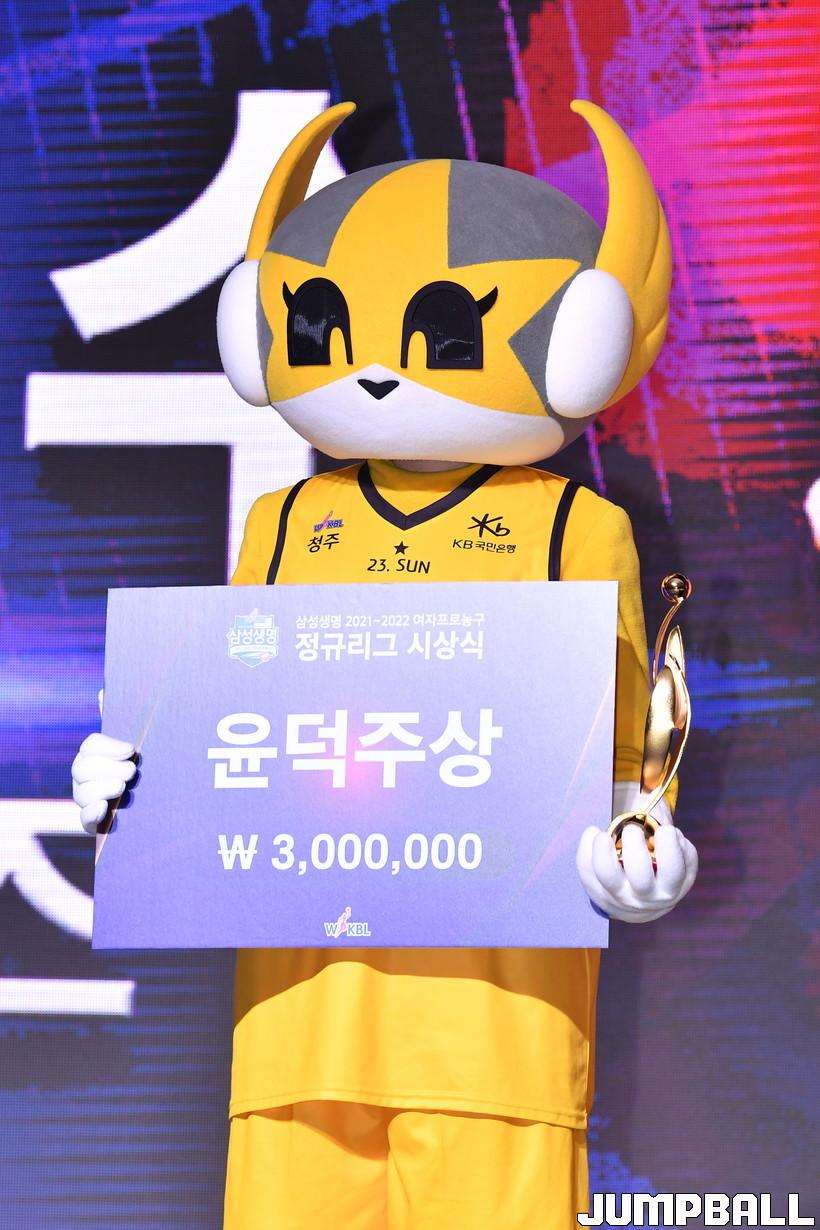 28일 서울 여의도 63컨벤션센터 2층 그랜드볼룸에서 열린 '삼성생명 2021-2022 여자프로농구 정규리그 시상식', WKBL 윤덕주상으로 KB스타즈 박지수가 수상했지만 코로나 확진으로 마스코트가 수상하고 있다.