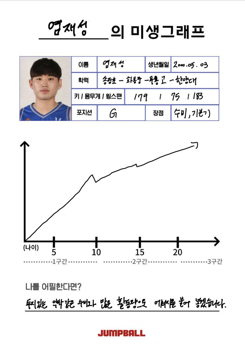 마지막으로 “볼 핸들러 수비는 누구 한테도 뒤쳐지지 않는다는 자신감이 있어요. 수비에서는 누구에게도 지지 않는 다는 생각이기 때문에, 수비에서 팀에 공헌을 할 수 있을 것 같아요. 수비나 투지, 근성, 활동량으로 팀의 에너자이저가 되고 싶어요. 이를 통해 팀에 에너지를 불어넣어서 보탬이 되는 선수가 되겠습니다”라며 각오를 남긴 염재성이다.