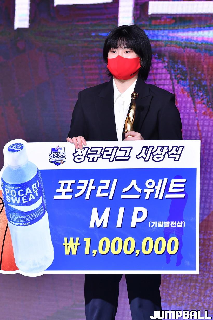 28일 서울 여의도 63컨벤션센터 2층 그랜드볼룸에서 열린 '삼성생명 2021-2022 여자프로농구 정규리그 시상식', BNK 이소희가 포카리스웨트 MIP상을 수상하고 있다.