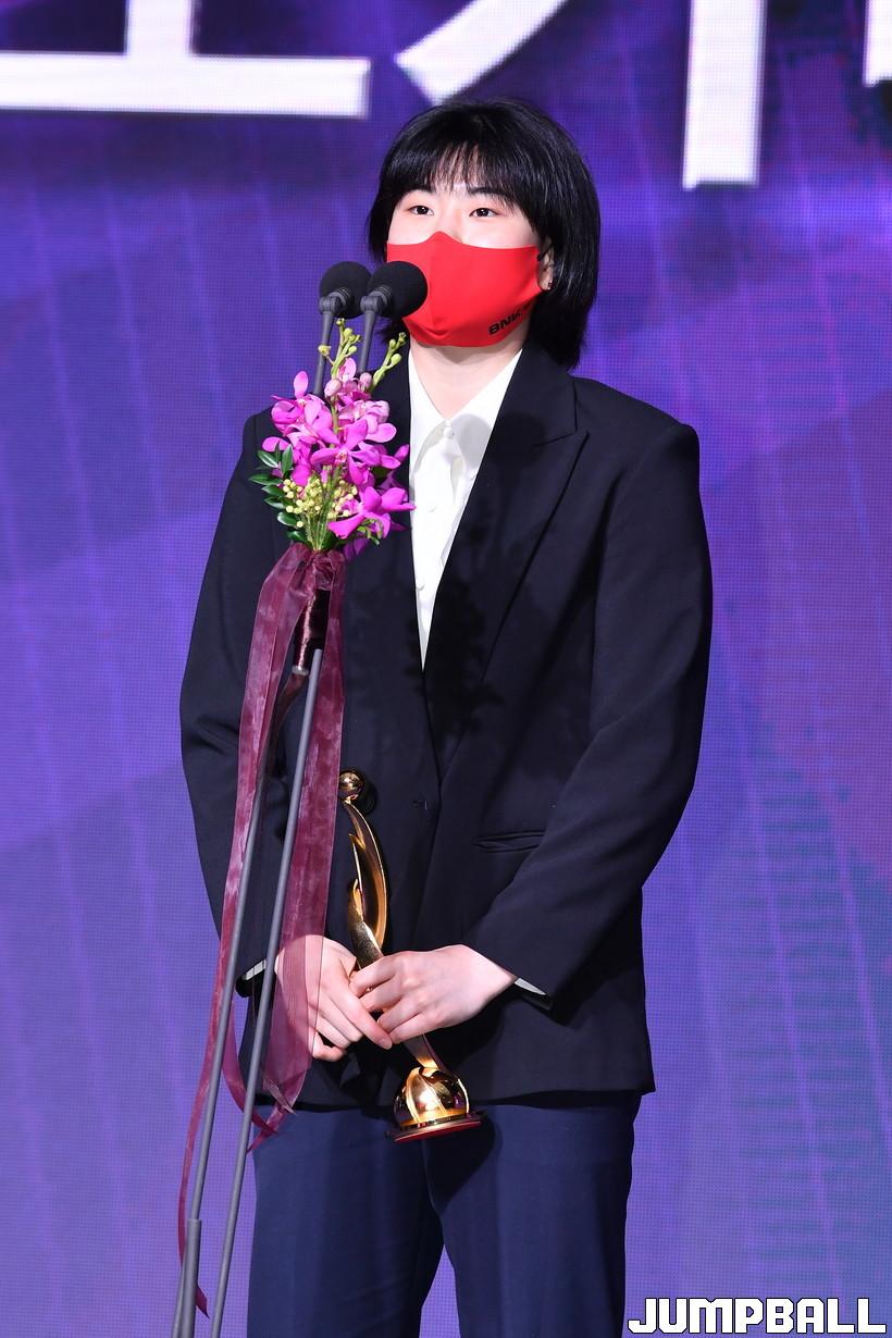 28일 서울 여의도 63컨벤션센터 2층 그랜드볼룸에서 열린 '삼성생명 2021-2022 여자프로농구 정규리그 시상식', BNK 이소희가 포카리스웨트 MIP상을 받은후 수상소감을 전달하고 있다.