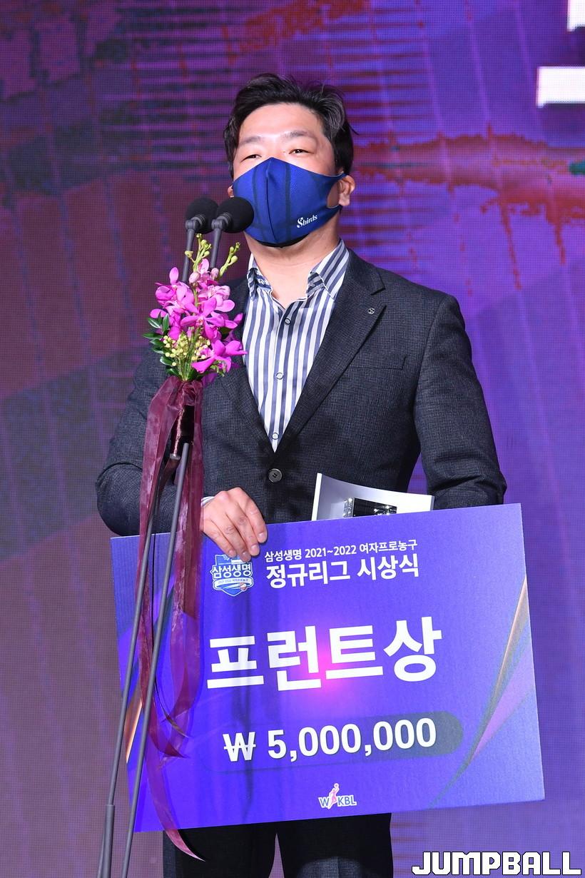28일 서울 여의도 63컨벤션센터 2층 그랜드볼룸에서 열린 '삼성생명 2021-2022 여자프로농구 정규리그 시상식', WKBL 프런트상으로 신한은행이 수상해 김태경 사무국장이 수상소감을 전달하고 있다.