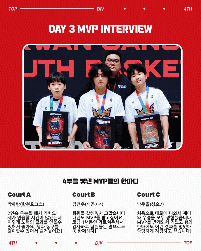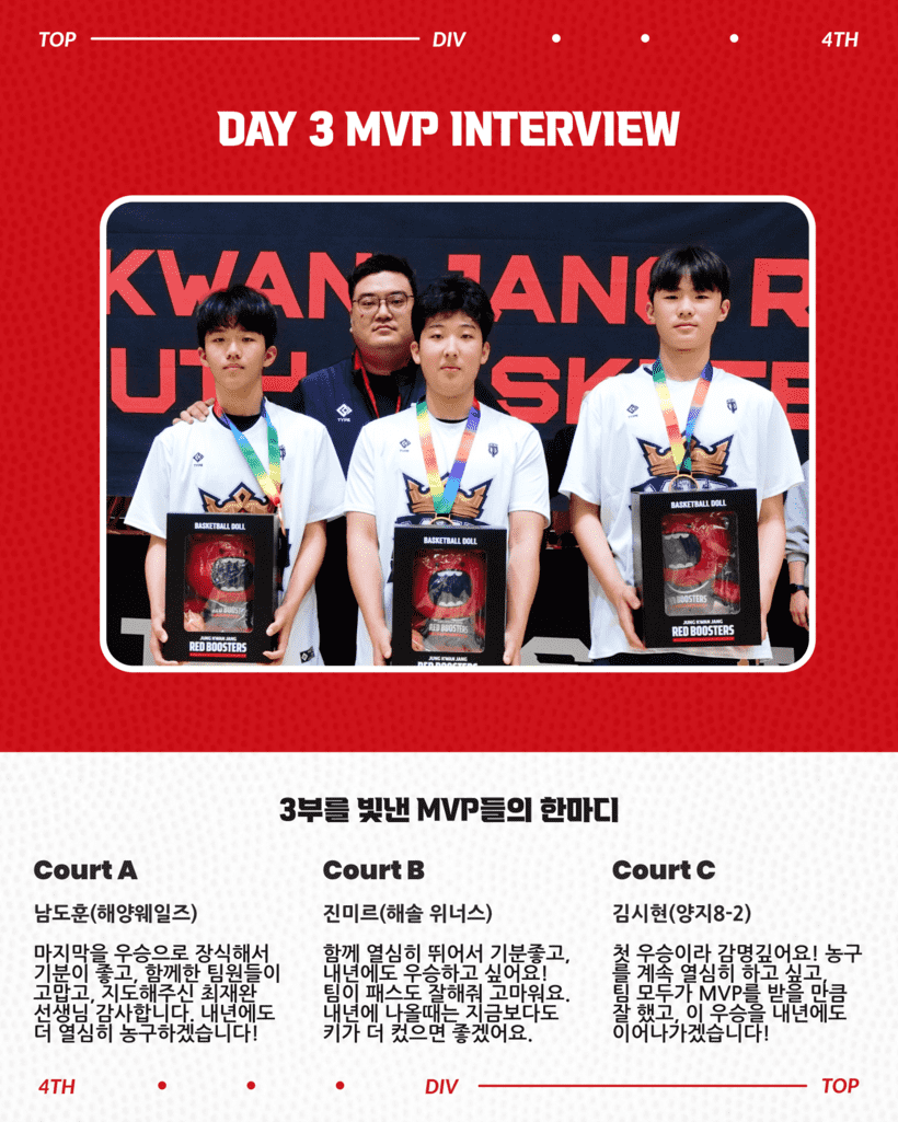 김시현(양지8-2)_처음으로 우승을 차지해서 너무 기쁘고 앞으로도 계속 농구하고 싶다는 생각이 들었어요. 사실 저 말고도 MVP 자격이 있는 친구들이 많거든요. 다른 친구들에게도 고맙다고 말하고 싶어요. 내년에도 계속 농구하면서 상위 디비전에서도 우승하고 싶습니다!