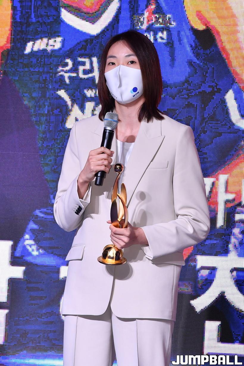 28일 서울 여의도 63컨벤션센터 2층 그랜드볼룸에서 열린 '삼성생명 2021-2022 여자프로농구 정규리그 시상식', WKBL 베스트5 상을 수상한 우리은행 박혜진이 수상소감을 전하고 있다.