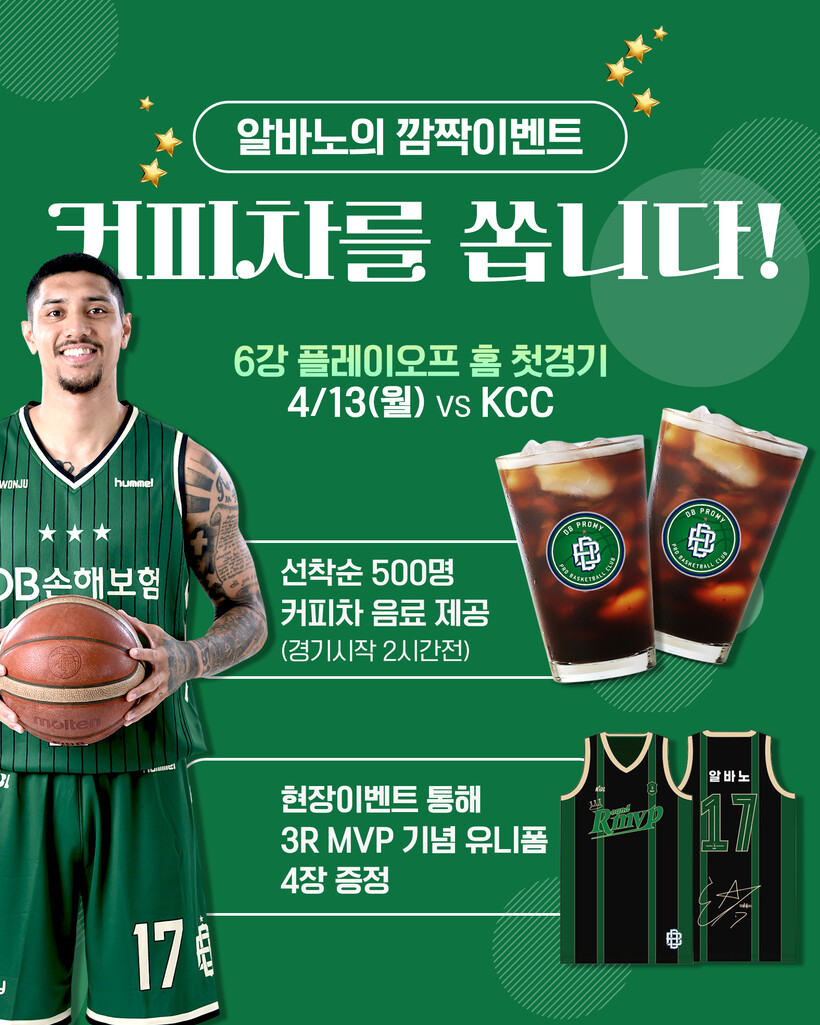 원주 DB는 12일 보도자료를 통해 “이선 알바노가 오는 4월 13일 부산 KCC와의 6강 플레이오프 첫 홈경기에 팬들에게 깜짝 이벤트를 진행한다”고 밝혔다.