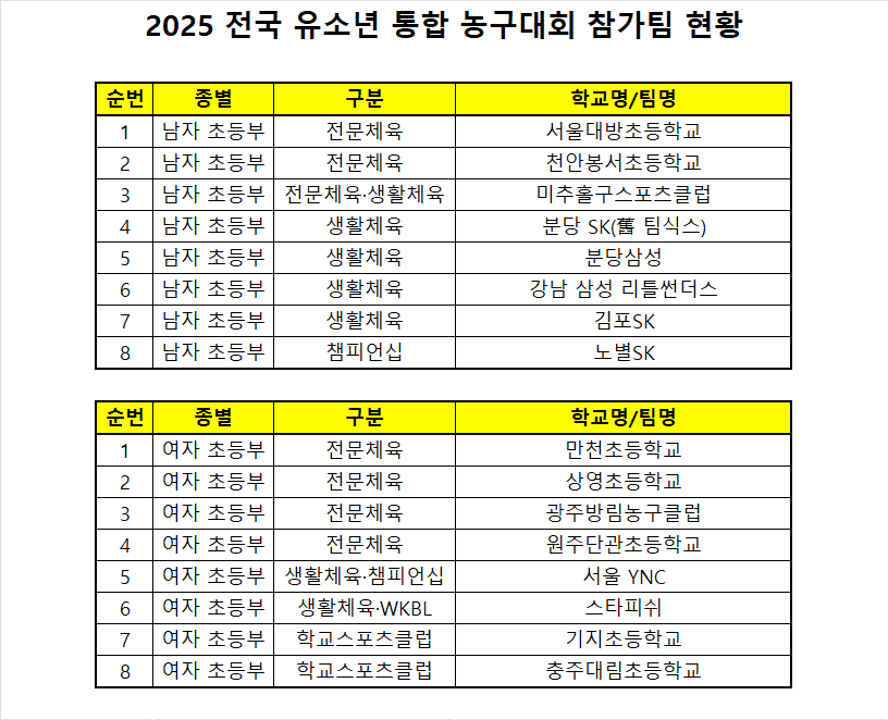 *2025 전국유소년 우수팀 초청 통합유소년 농구대회 참가팀 현황*