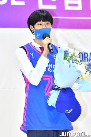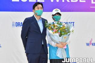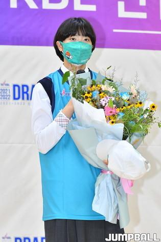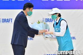 8일 용인 용인실내체육관에서 열린 2021-2022 WKBL 신입선수 선발회. 1라운드 4순위로 KB에 지명된 신예영이 김완수 감독에게 거대한 꽃다발을 전달받고 있다.