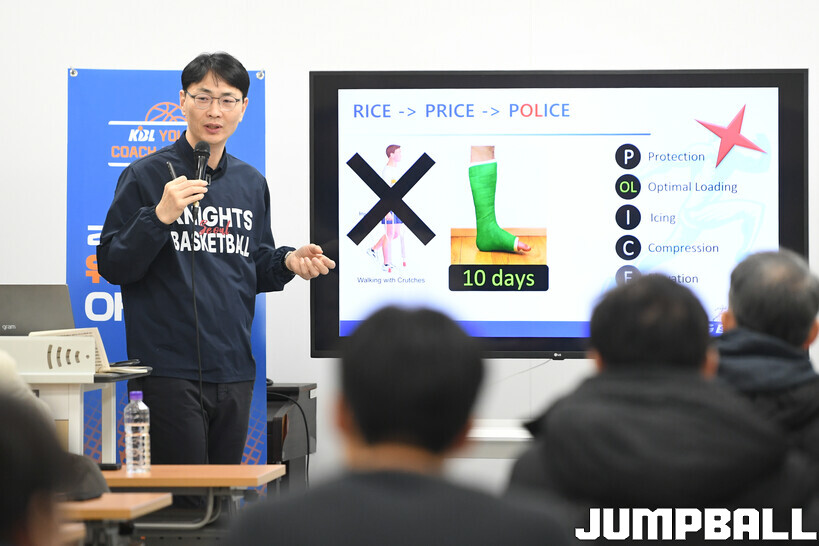 1기에 이어 2기 역시 첫 교육은 ‘농구 유소년 지도자를 위한 스포츠 손상 예방 교육’이었으며, 족부 분야 최고 권위자로 꼽히는 세종스포츠 정형외과 김진수 원장이 강사로 나섰다.