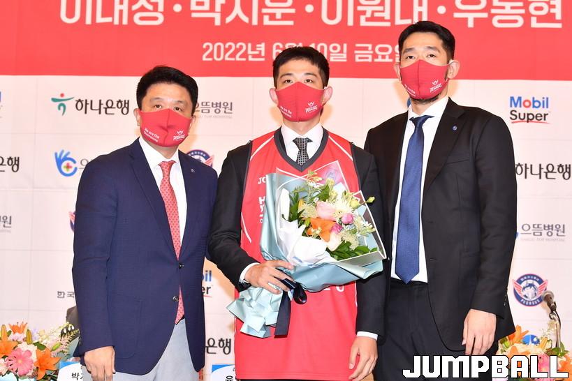 10일 서울 대한상공회의소 중회의실에서 열린 한국가스공사 페가수스 프로농구단 입단식. 한국가스공사 이원대가 유도훈 감독과 차바위와 기념촬영을 하고 있다.
