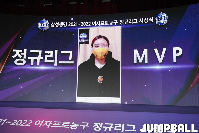 28일 서울 여의도 63컨벤션센터 2층 그랜드볼룸에서 열린 '삼성생명 2021-2022 여자프로농구 정규리그 시상식', KB 박지수가 화상연결을 통해 MVP 수상소감을 전하고 있다.