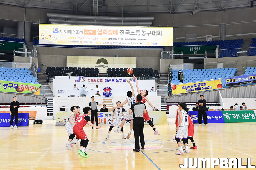 [점프볼=김천/박상혁 기자] 14일 김천체육관에서 열린 아이에스동서 제25회 협회장배 전국초등농구대회 1일차, KCC구리다산과 인천안산초의 개막전 경기가 점프볼로 시작되었다.