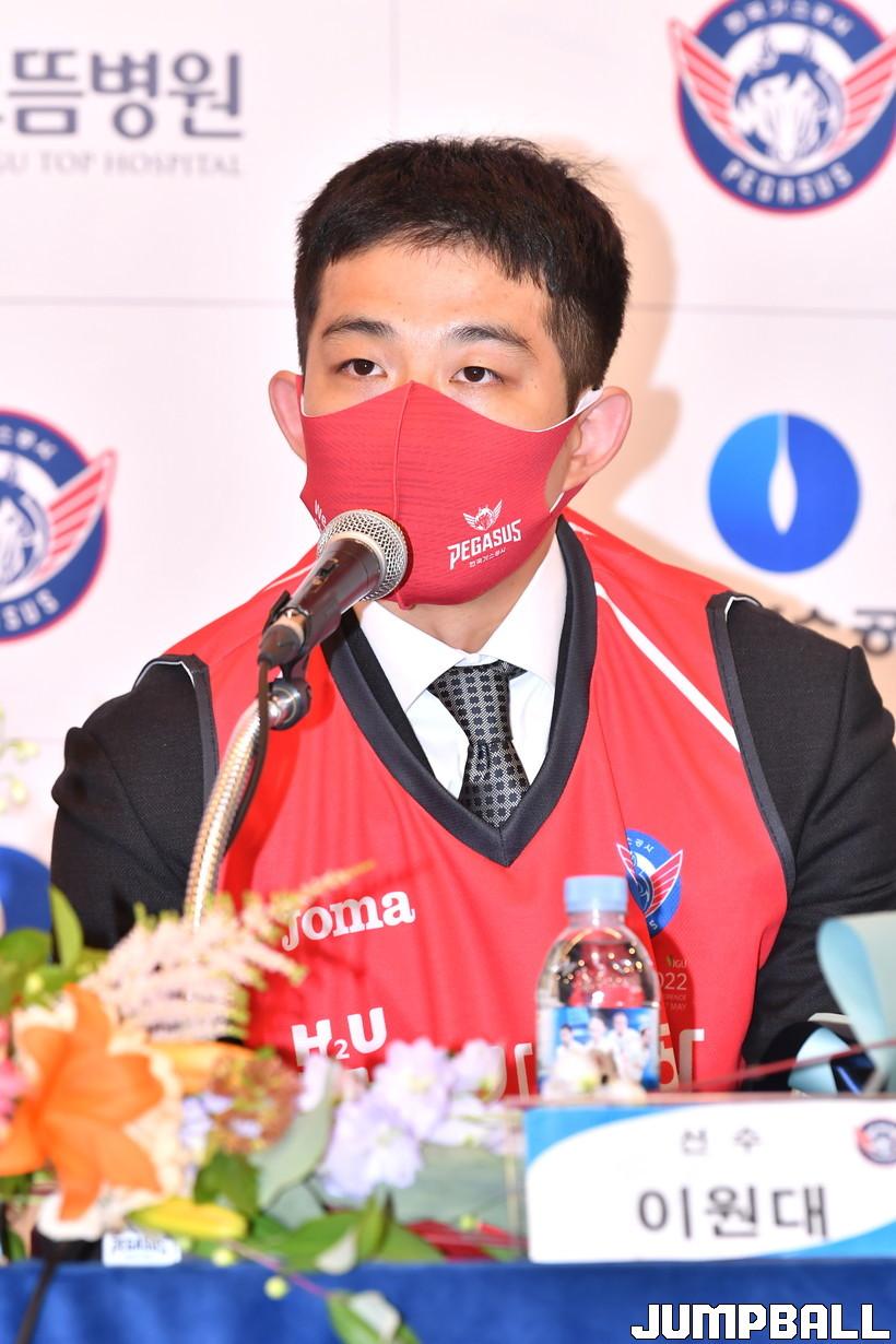 10일 서울 대한상공회의소 중회의실에서 열린 한국가스공사 페가수스 프로농구단 입단식. 한국가스공사 이원대가 찾아온 기자들에게 인사를 전하고 있다.