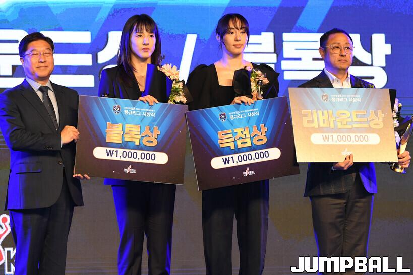 6일 여의도 63컨벤션센터 그랜드볼룸에서 열린 신한은행 SOL 2022-2023 여자프로농구 정규리그 시상식, 블록상에 우리은행 김단비, 득점상에 신한은행 김소니아, BNK썸 진안이 리바운드사을 수상했다.