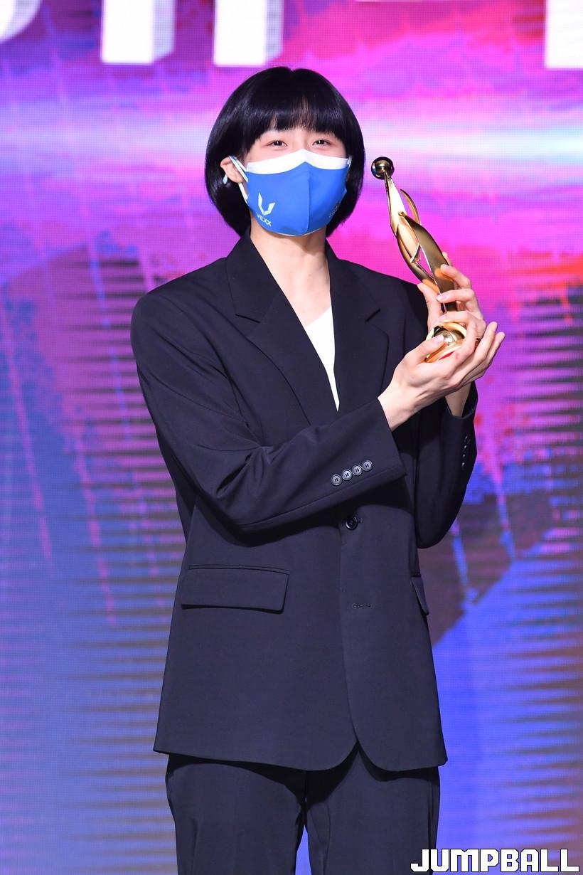 28일 서울 여의도 63컨벤션센터 2층 그랜드볼룸에서 열린 '삼성생명 2021-2022 여자프로농구 정규리그 시상식', 삼성생명 이해란이 시상식을 마친후 트로피를 들고 포즈를 취하고 있다.