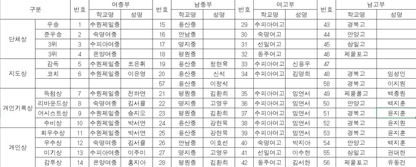 이변은 없었다. 각 종별 우승후보들이 이변없이 순항하며 시즌 첫 우승 타이틀을 따냈다. 우승을 차지한 4팀 모두 매 경기 압도적인 경기력을 선보이며 ‘넘사벽’의 면모를 유감없이 발휘했다. 남중부에선 용산중이, 여중부에선 수원제일중이, 남고부는 경복고, 여고부는 광주수피아여고에게로 우승컵이 돌아갔다.