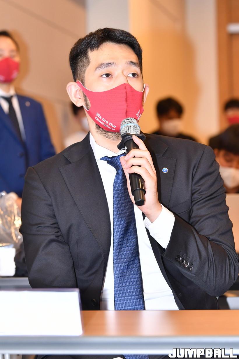 10일 서울 대한상공회의소 중회의실에서 열린 한국가스공사 페가수스 프로농구단 입단식. 한국가스공사 차바위가 기자의 질문에 답변하고 있다.