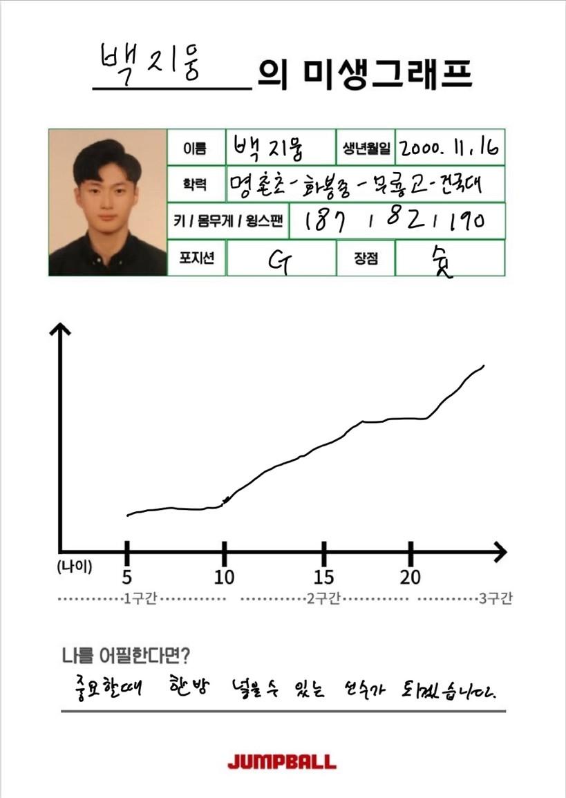 프로 무대에서 4쿼터에 중요한 한방을 터뜨릴 백지웅의 모습을 볼 수 있을까. 비교적 늦은 나이에 농구를 시작한 백지웅이 꿈의 무대를 밟을 수 있을지 주목해보자. 백지웅은 대학생 신분으로 종별 선수권대회와 U-리그 본선 무대를 남겨두고 있다.