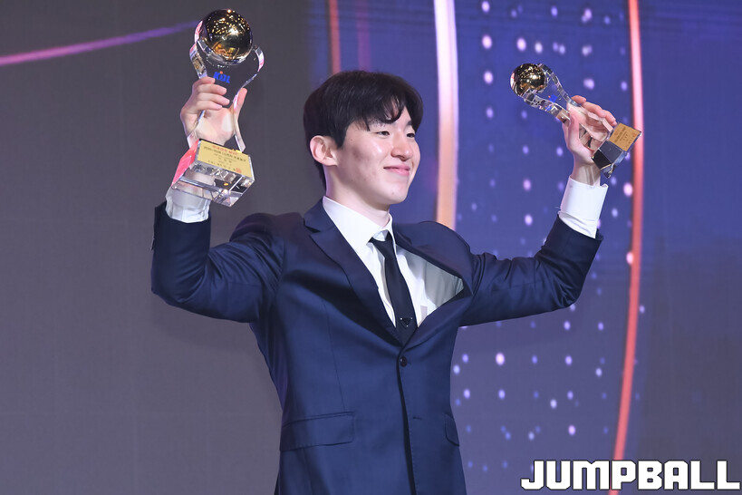 하윤기도 2022~2023시즌 기량발전상과 수비5걸로 시상식 단상에 올랐다.
