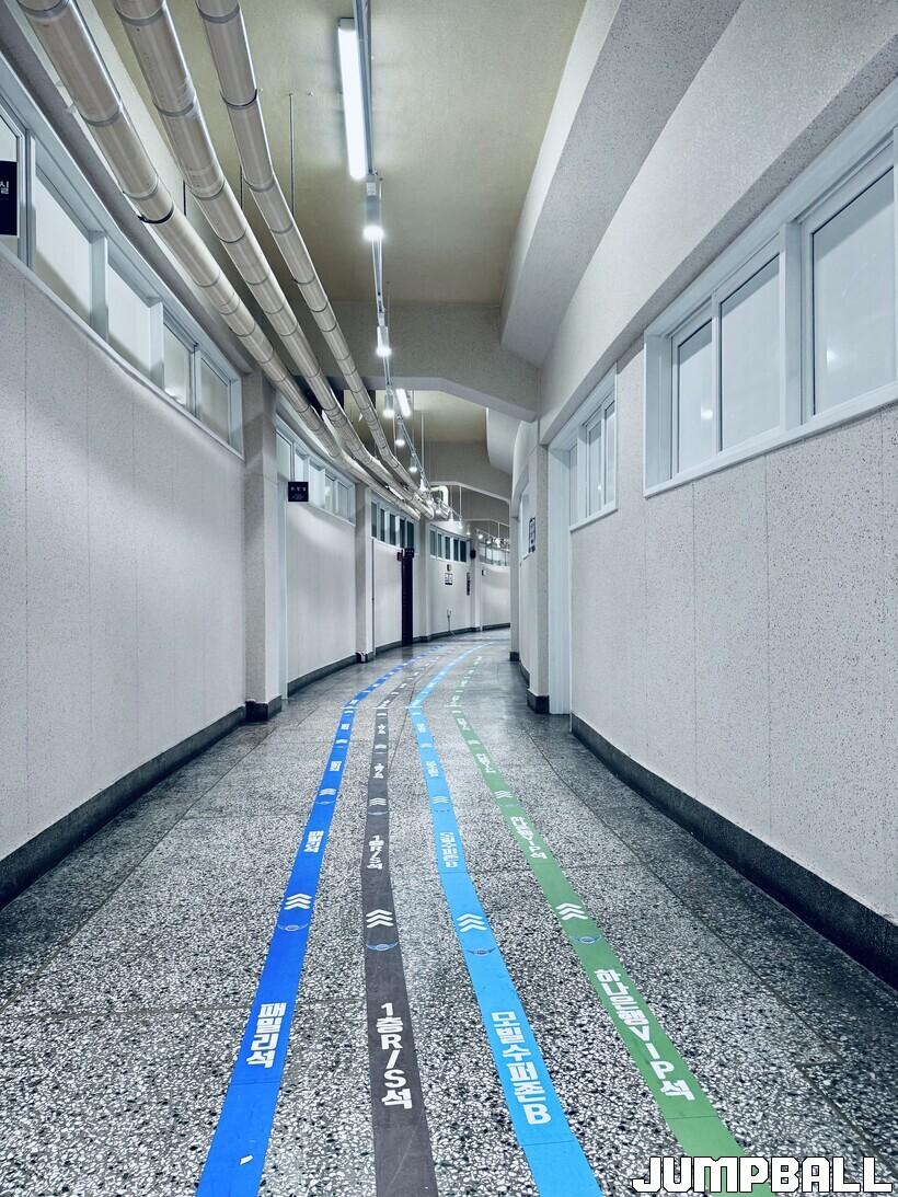 우선 특석 관중들의 이동 경로인 체육관 복도에 레일 조명을 설치하고, 벽과 창문들도 흰색으로 페인트를 새롭게 칠했다. 이 때문에 칙칙함에서 벗어나 굉장히 밝은 분위기로 바뀌었다.