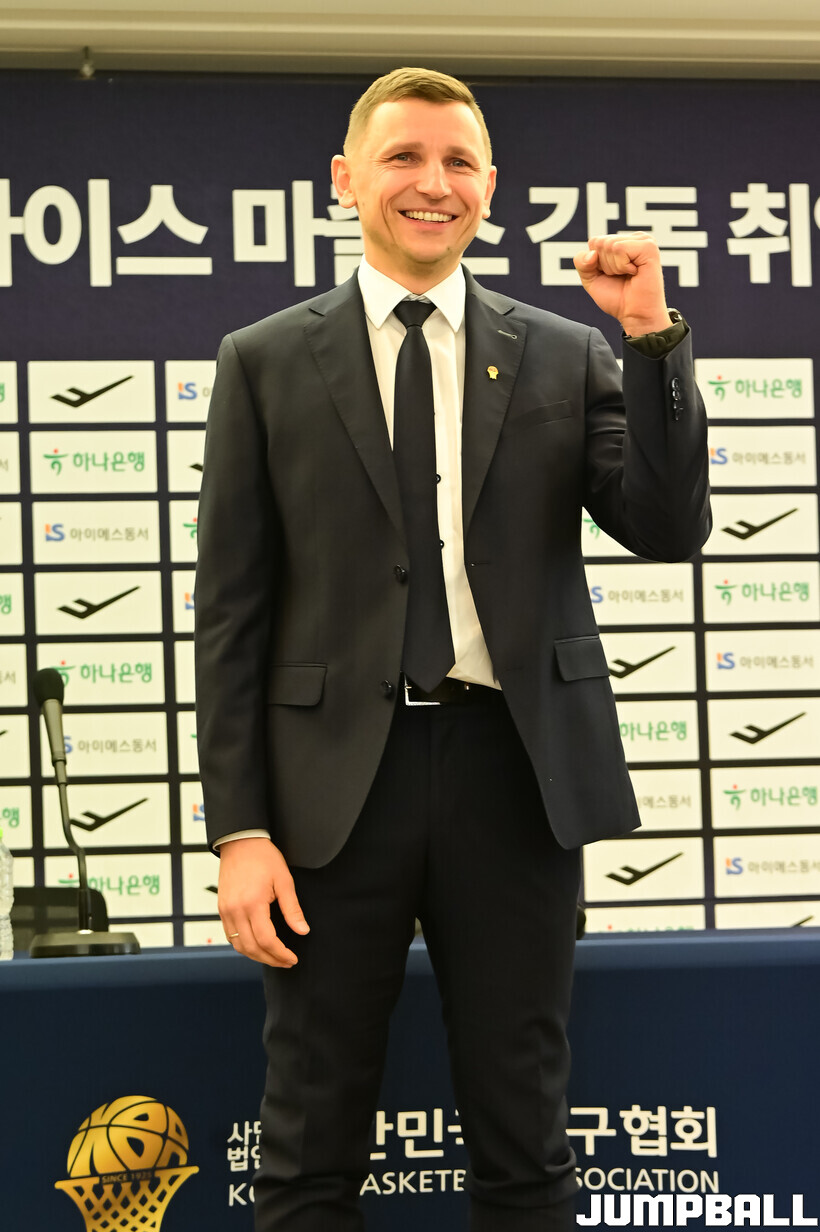 [점프볼=서울/박상혁 기자]16일 중구 프레스센터에서 열린 남자농구 국가대표팀 니콜라이스 마줄스 감독 취임 기자회견, 니콜라이스 마줄스 감독이 화이팅 포즈를 기념 사진 촬영을 하고 있다.
