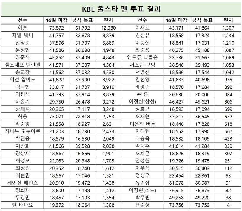 지난 16일 오후 5시 투표 마감 시점과 KBL이 발표한 팬 투표 결과를 비교하면 선수들의 부정 투표 현황까지 알 수 있다.