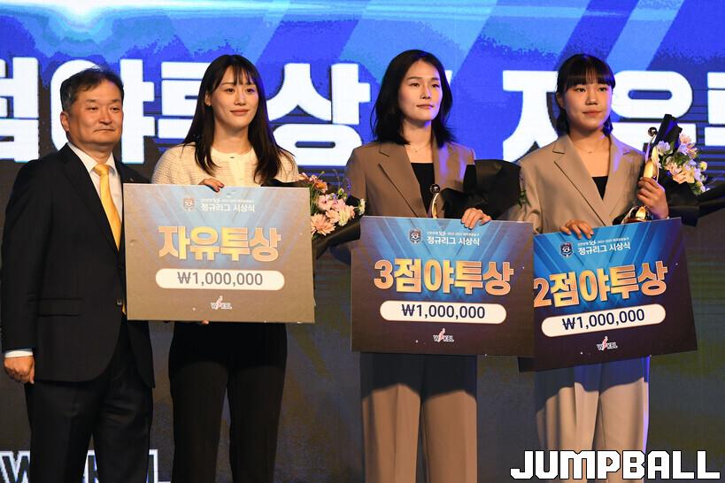 6일 여의도 63컨벤션센터 그랜드볼룸에서 열린 신한은행 SOL 2022-2023 여자프로농구 정규리그 시상식, KB스타즈 강이슬이 자유투상, 우리은행 최이샘이 3점야투상, 우리은행 박지현이 2점야투상을 수상했다.