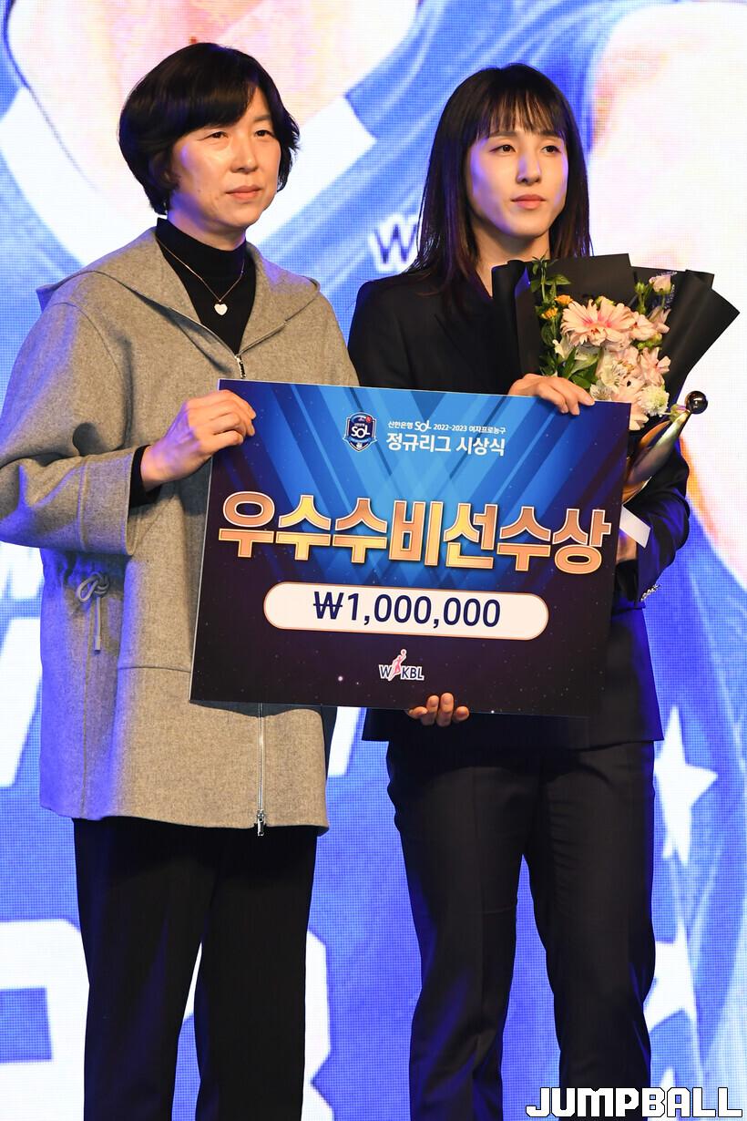 6일 여의도 63컨벤션센터 그랜드볼룸에서 열린 신한은행 SOL 2022-2023 여자프로농구 정규리그 시상식, 우리은행 김단비가 우수수비선수상을 수상하고 있다.