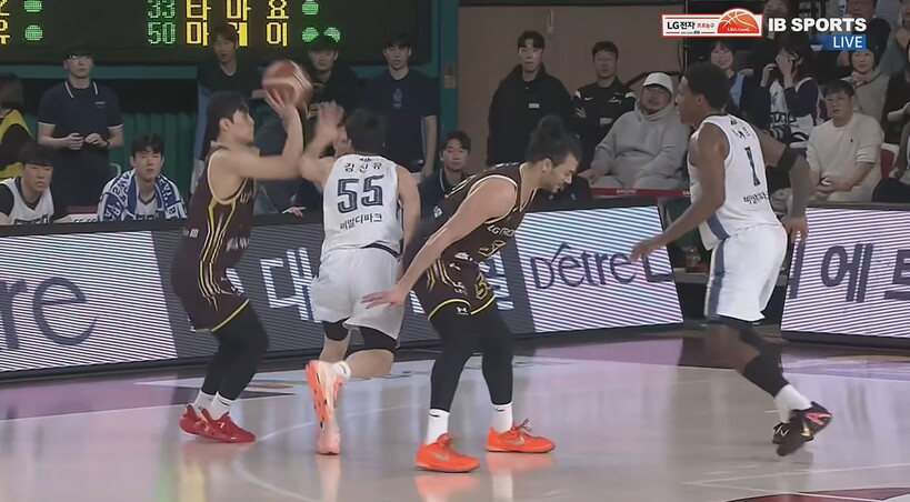 양준석이 엔드라인에서 인바운드 패스를 했다. 마레이가 최형찬의 스크린을 받은 뒤 패스를 받자마자 탭슛처럼 슛을 시도했고, 그대로 림을 통과했다.