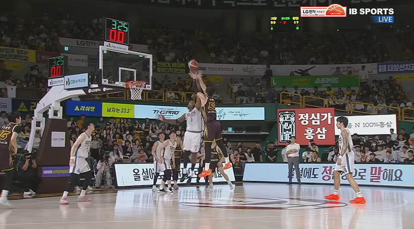 이 때 본부석에서 부저로 심판들을 다시 불러들였다. 영상을 다시 본 심판은 “비디오 판독 결과 조금 전 상황에서는 (3점슛 여부를 가릴 수 있는) 장면이 나오지 않았는데 지금은 장면이 나왔습니다”며 “유기상의 3점슛은 라인을 밟았기 때문에 2점슛으로 정정하겠습니다”고 했다.