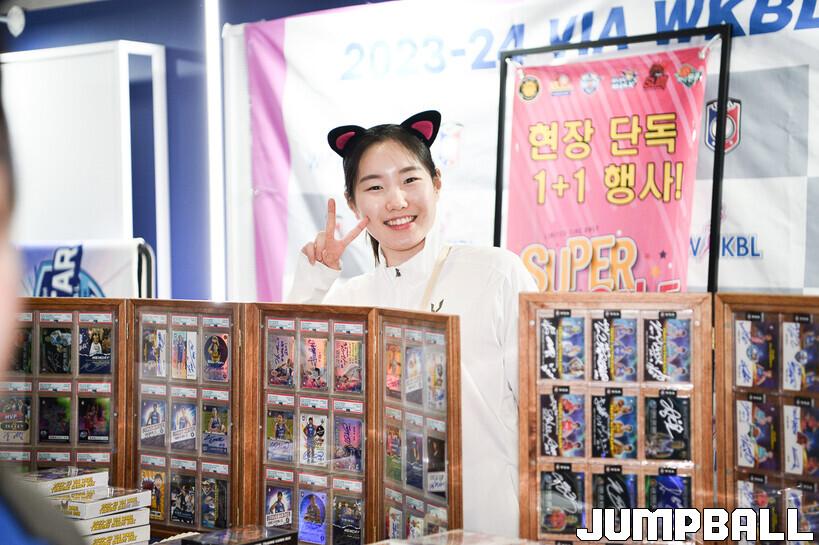[점프볼=아산/유용우 기자] 07일 아산 이순신체육관에서 열린 우리은행 우리WON 2023~2024 여자프로농구 올스타 페스티벌, 김지영이 포토카드 매장에서 팬 서비스를 진행하고 있다.