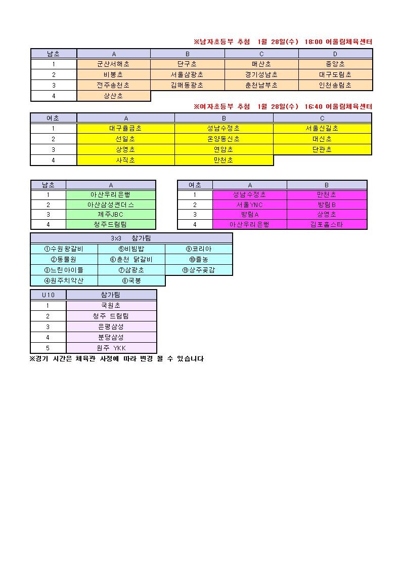 한편, 이번 대회는 엘리트부(남: 13팀, 여: 11팀)와 챌린저부(남: 4팀, 여: 8팀), 3x3부(11팀), U10부(5팀) 등 4개 종별에 걸쳐 총 52팀이 참가하며, 엘리트부, 챌린저부, 3x3부는 조별 예선을 거쳐 결선은 토너먼트제로 치러지며, U10부는 풀 리그로 우승자를 가린다.