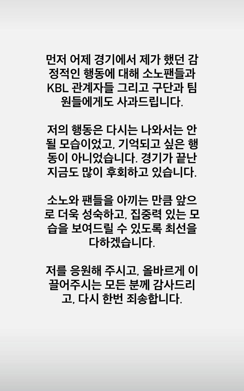 그는 “다시는 나와서는 안 될 모습이었다. 기억되고 싶은 행동이 아니었다. 경기가 끝난 지금도 많이 후회하고 있다. 소노와 팬들을 아끼는 만큼 앞으로 더욱 성숙하고 집중력 있는 모습을 보여드릴 수 있도록 최선을 다하겠다. 나를 응원 해주시고, 올바르게 이끌어주시는 모든 분께 감사드리고, 다시 한번 죄송하다”고 사과했다.