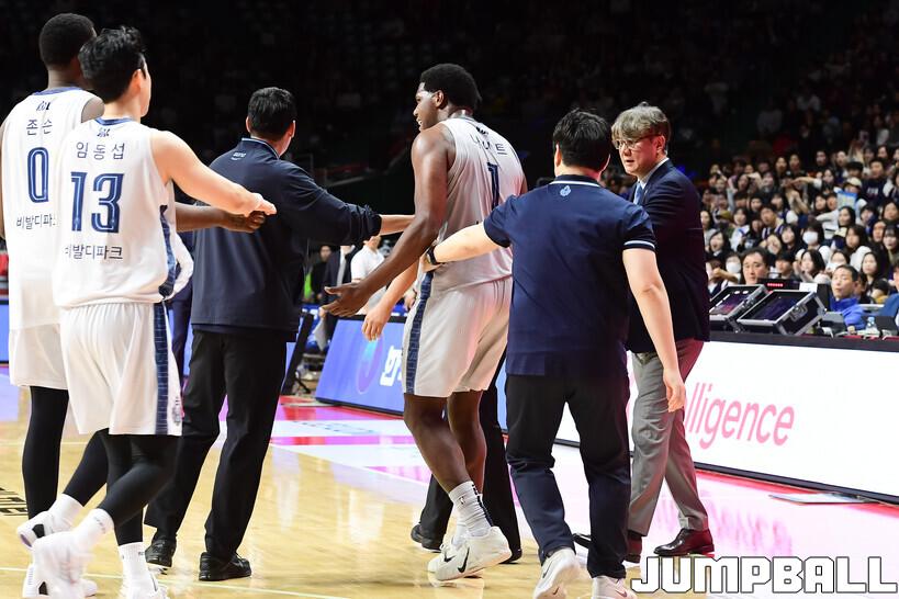 숀 롱과 리바운드 경합 도중 파울을 범해 5반칙 퇴장이 선언됐는데, 여기서 흥분을 참지 못했다. 심판 판정에 강하게 항의했다. 선수들은 물론이고 손창환 감독까지 말렸지만, 계속해서 분노를 참지 못했다. 시설물까지 건드리며 라커룸으로 향한 것으로 알려졌다.