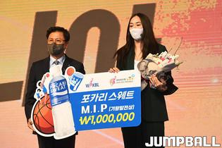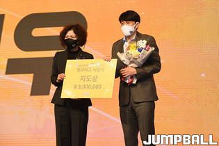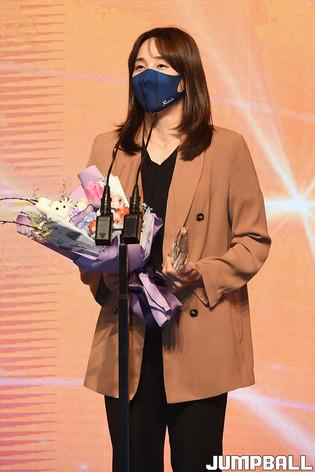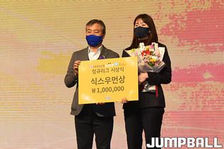 [점프볼=서울/박상혁 기자] 25일 여의도 63컨벤션센터 그랜드볼룸에서 'KB국민은행 Liiv M 2020 여자프로농구' 정규리그 시상식이 열렸다. 대한민국농구협회 권혁운 회장이 베스트 5 시상을 하고 있다.