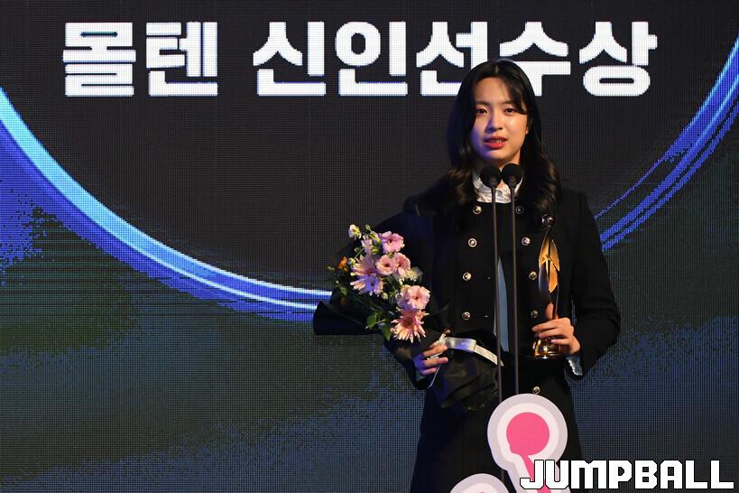 6일 여의도 63컨벤션센터 그랜드볼룸에서 열린 신한은행 SOL 2022-2023 여자프로농구 정규리그 시상식, 하나원큐 박소희가 신인선수상을 받고 난 소감을 얘기하고 있다.