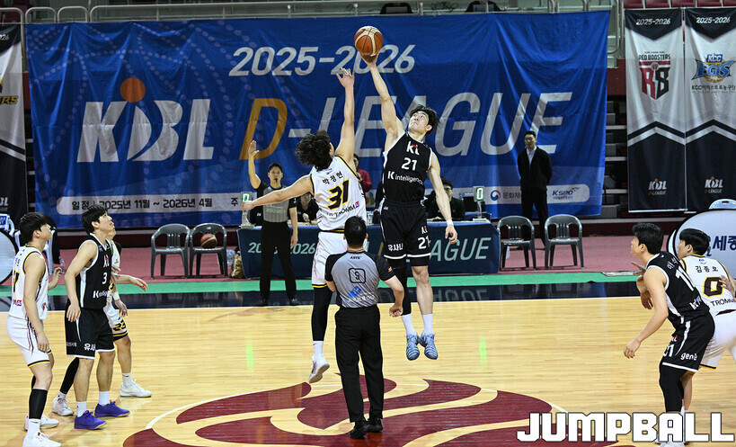 [점프볼=용인/문복주 기자] 25일 경희대 선승관 체육관에서 열린 2025-2026 KBL D-리그 4강전 수원 KT와 창원 LG의 경기에서 KT 이두원이 경기시작 점프볼을 선점하고 있다.